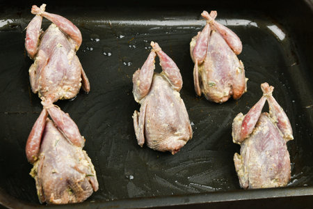 baking quail on a baking sheet. cooking quail. Lies on the forehead, in front of the oven. close-up