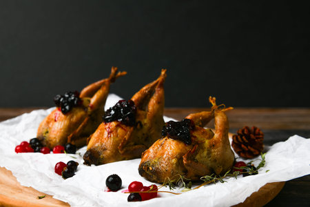 Cooking quail against a dark background. On a wooden background. low key. Little turkey.