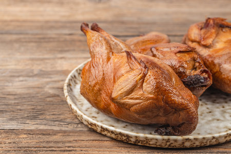 Smoked quail meat on a plate. A photo. poultry, quail, cooking
