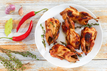 grilled whole quails with thyme on dish on white wooden background with chili peppers, bay leaf and garlic, view from above