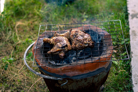 Chicken grilled on fire outdoor traditional asian food with herb