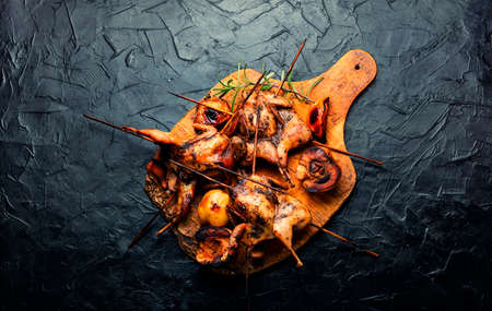 Quails on the grill. Grilled chicken meat.