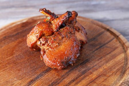 Tasty Smoked grilled quail meat with thyme on a wooden board,