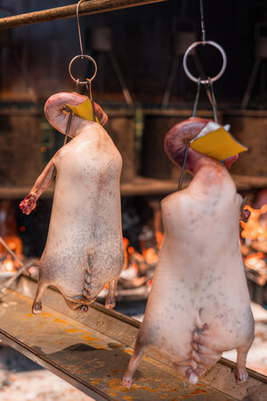 Roasted ducks and ribs hanging on rack showcase in restaurant's kitchen, concept of national food