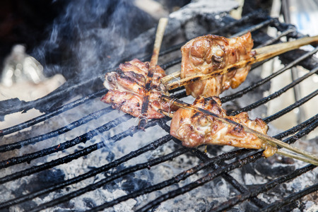 Selective focus of Grilled pork and chicken on a street food grill.