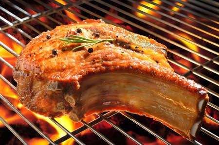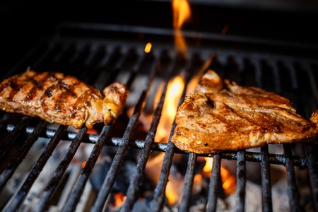 Grilled pork chop on the flaming grill