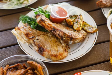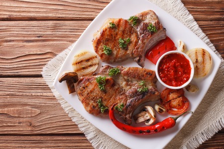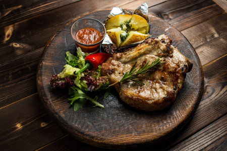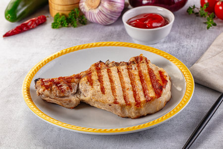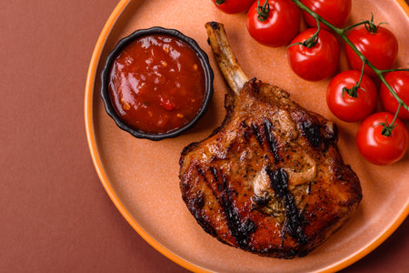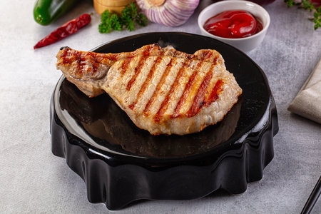 Tasty hot grilled bone pork steak served sauce