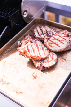 Grilling pork chops on gas grill in the Summer.