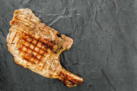 Steak, beef or pork on the bone, meat cooked on the grill with rosemary, salt and spices. Steak on the bone as a food background for your design