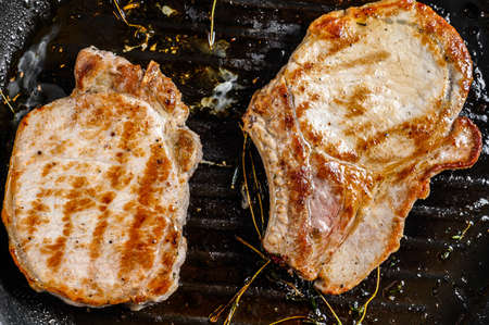 grilled pork chop on grill pan with rosemary. top view. background.
