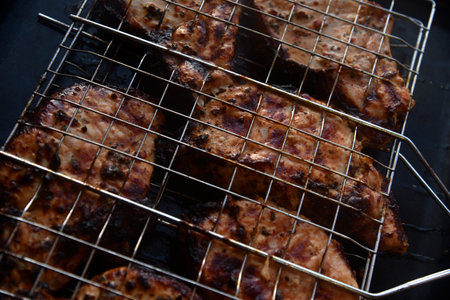 Grilled meat. Pork loin in an iron mesh. Delicious pork meat. Barbecue.
