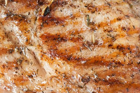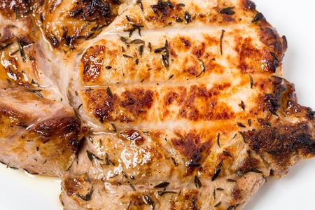 juicy piece of pork meat grilled and seasoned with spices and herbs