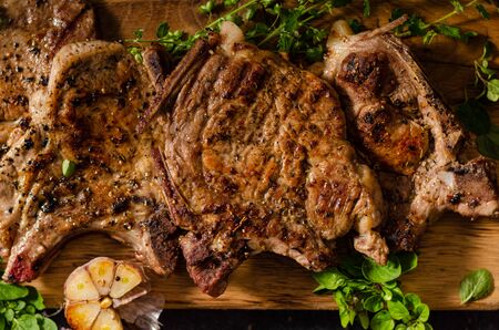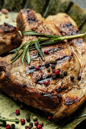 Grilled pork chops with rosemary. Food recipe background. close up.