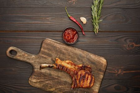 Top view of delicious ribeye steak on cutting board with chili sauce, rosemary and garlic on wooden background