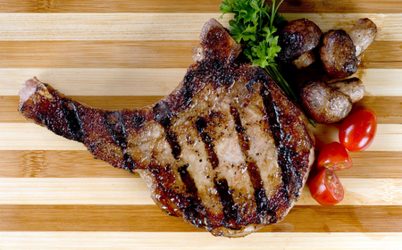 A piece of grilled pork steak on the bone which stands on a wooden board next to stand mushrooms fried on the grill. Nearby are tomatoes and rosemary. Top views