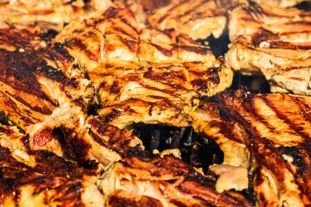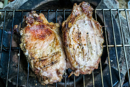 Chicken and pork steak grilled on a charcoal barbeque. Top view of camping tasty barbecue, food concept, food on grill and detail of food on the grill