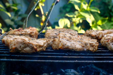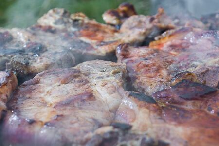 Frying juicy pieces of fresh pork neck steak meat prepared on grill or outdoor barbecue lattice in backyard. Smoke on charcoal. Selective focus. Close-up. Outdoors.