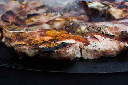 Grilling Iberian pork steaks on a barbecue with charcoal. BBQ.