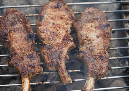 Pork chops are being grilled on barbecue