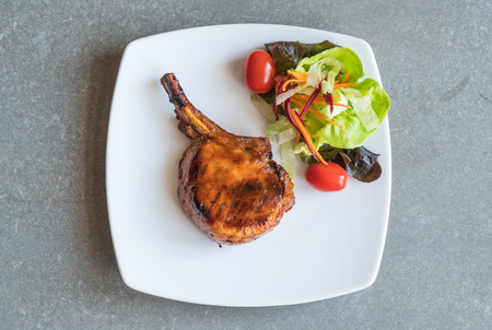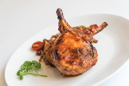 Grilled pork chop steak with vegetable in white plate