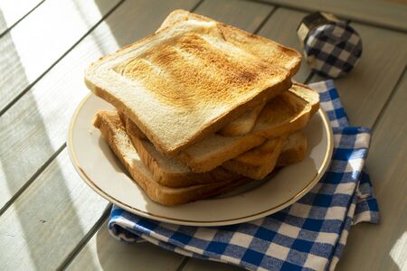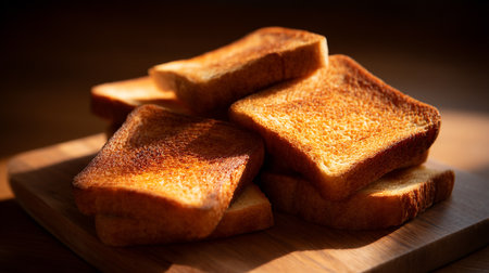 Golden brown toast slices stacked on a wooden board, morning breakfast