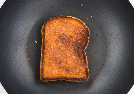 Two charred pieces of toast rest on a light wooden backdrop, accentuating the stark contrast with their dark, crunchy crusts