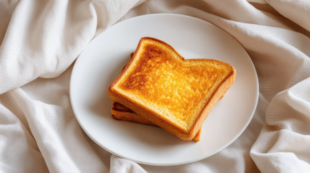 A beautifully toasted slice of bread rests on a white plate, creating a warm and inviting breakfast scene. The soft fabric enhances the cozy vibe.