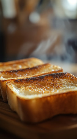 Toast slices leaning against each other with steam rising under warm natural light