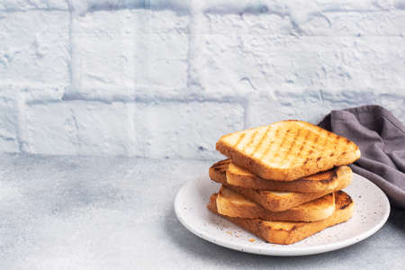 Bread toast crispy for sandwiches on a plate on a gray concrete table Copy space.