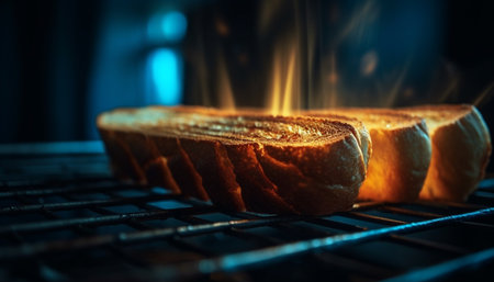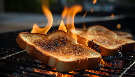 A dramatic scene of bread toasting with shimmering sparks in a cozy kitchen. Capture the lively energy of cooking and the magic of transformation.