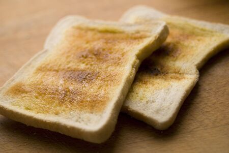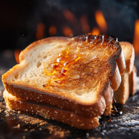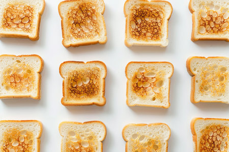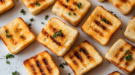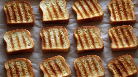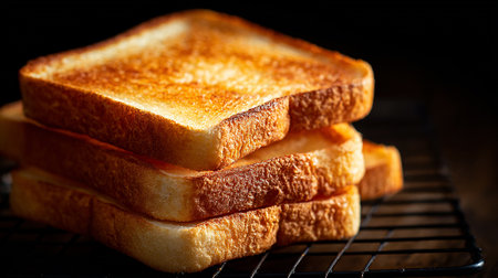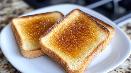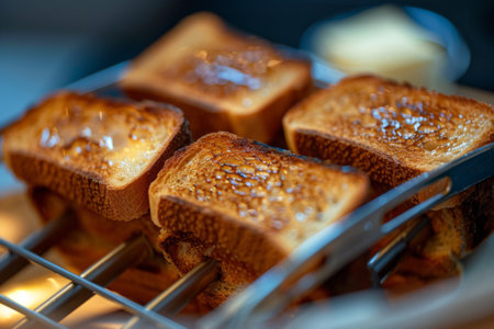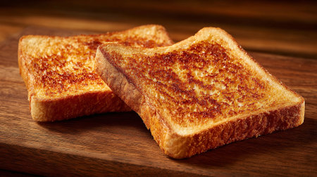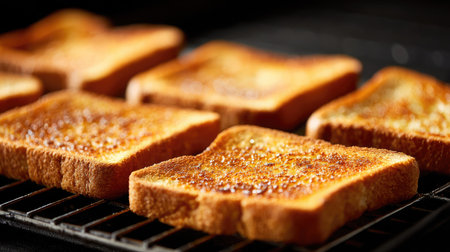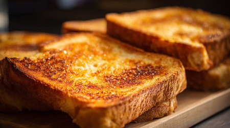 Golden brown toasted bread slices, crispy crust, fresh morning breakfast treat