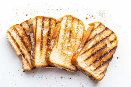 Slices of fresh toast bread, captured from the top, isolated on a white background, emphasizing their deliciously crisp edges