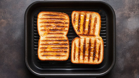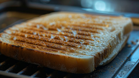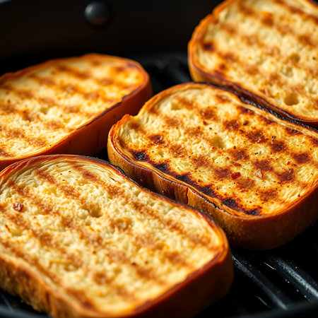 Close-up of toasted bread with visible grill lines and crispy golden texture