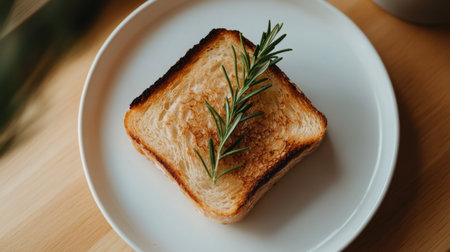 A minimalist shot of perfectly toasted bread slices on a white plate, garnished with a sprig of rosemary, emphasizing simplicity and elegance.