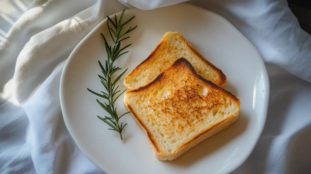Enjoy the simplicity of two golden slices of toasted bread arranged elegantly on a white plate, complemented by a sprig of fresh rosemary. Perfect for breakfast or a light snack!