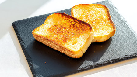 Enjoy this beautifully captured image of golden brown toast on a slate plate, showcasing its delicious texture and warmth under natural light.