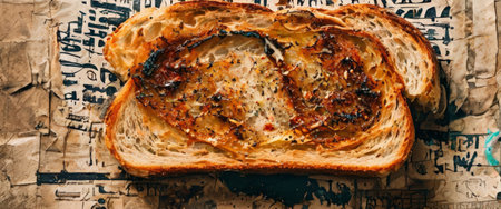 Slice of seasoned artisan bread on rustic paper background