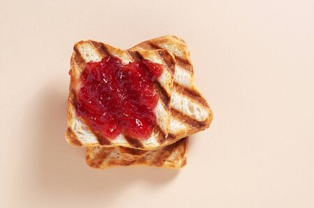 Stack of toasted bread with jam on a beige background close-up, top view