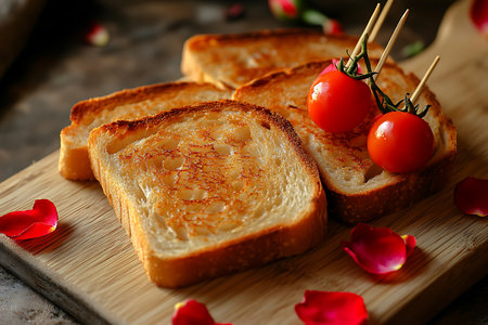 Golden toasted bread pieces are carefully arranged on a wooden surface, complemented by fresh tomato skewers and scattered rose petals, enhancing visual appeal.