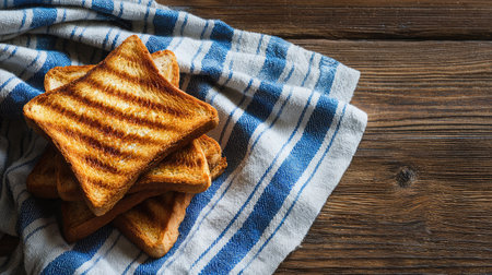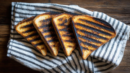 Evenly browned toast on a striped napkin over wooden table surface