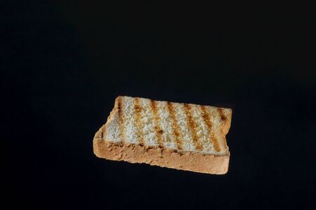 Slice of roasted white bread on black background close up. Conceptual photo