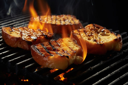 Closeup shot of delicious golden brown toasted bread slices with grill marks on a black grill grate, ready for a meal