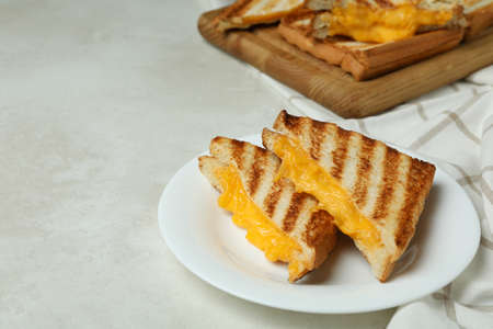 Concept of tasty eating with grilled sandwiches on white textured table