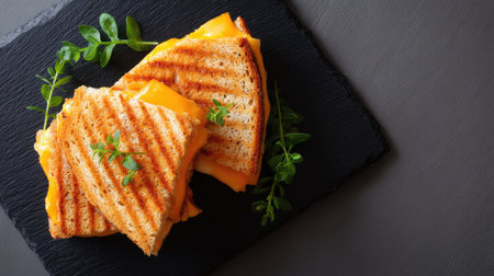 A delicious grilled cheese sandwich featuring melted cheddar cheese, served on a slate plate with fresh herbs. Perfect for a cozy meal or snack.