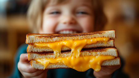 Generative AI Image of Little Boy Holding Grilled Cheese Sandwich with Cheerful Expression