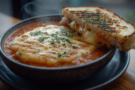 Grilled cheese in tomato soup, cafe, steam, lunch