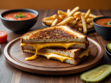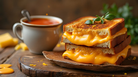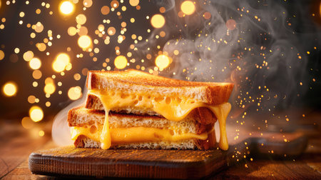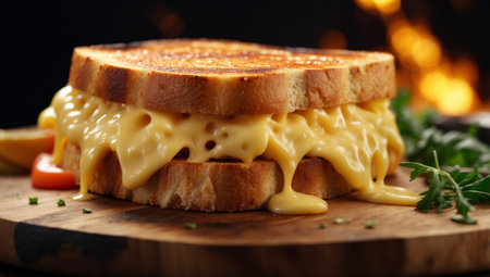 A mouthwatering grilled cheese sandwich sits on a rustic wooden board, featuring gooey melted cheese and crispy golden bread, creating a warm and inviting ambience.