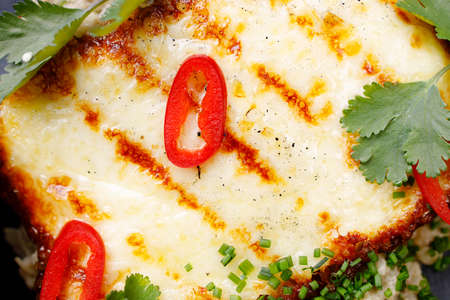 Grilled haloumi cheese on a black plate, close up