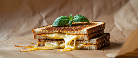 AI Generated. Delicious Grilled Cheese Sandwich with Melting Cheese and Fresh Basil on a Brown Paper Background