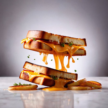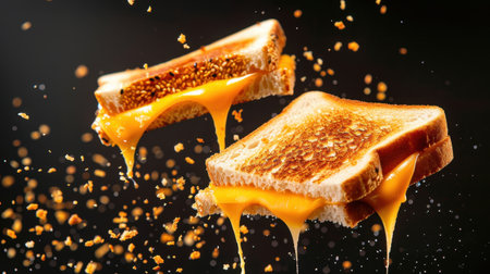 A stunning grilled cheese sandwich hovers in mid-air, perfectly cut in half. The warm, golden bread surrounds gooey melted cheese that stretches enticingly, creating a mouthwatering visual delight.